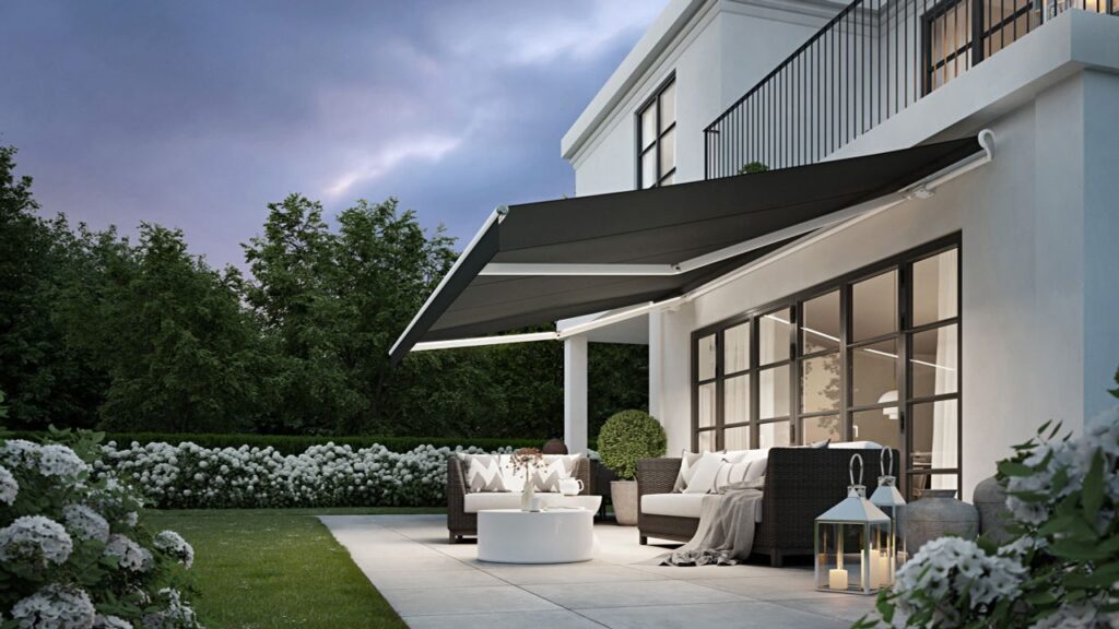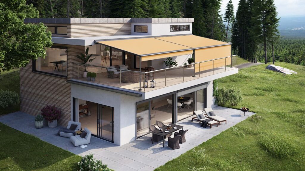 Öppen länkarmsmarkis för stora uteplatser och balkonger