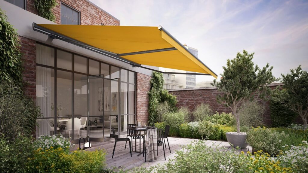 En länkarmsmarkis för uteplatser, balkonger och nischer